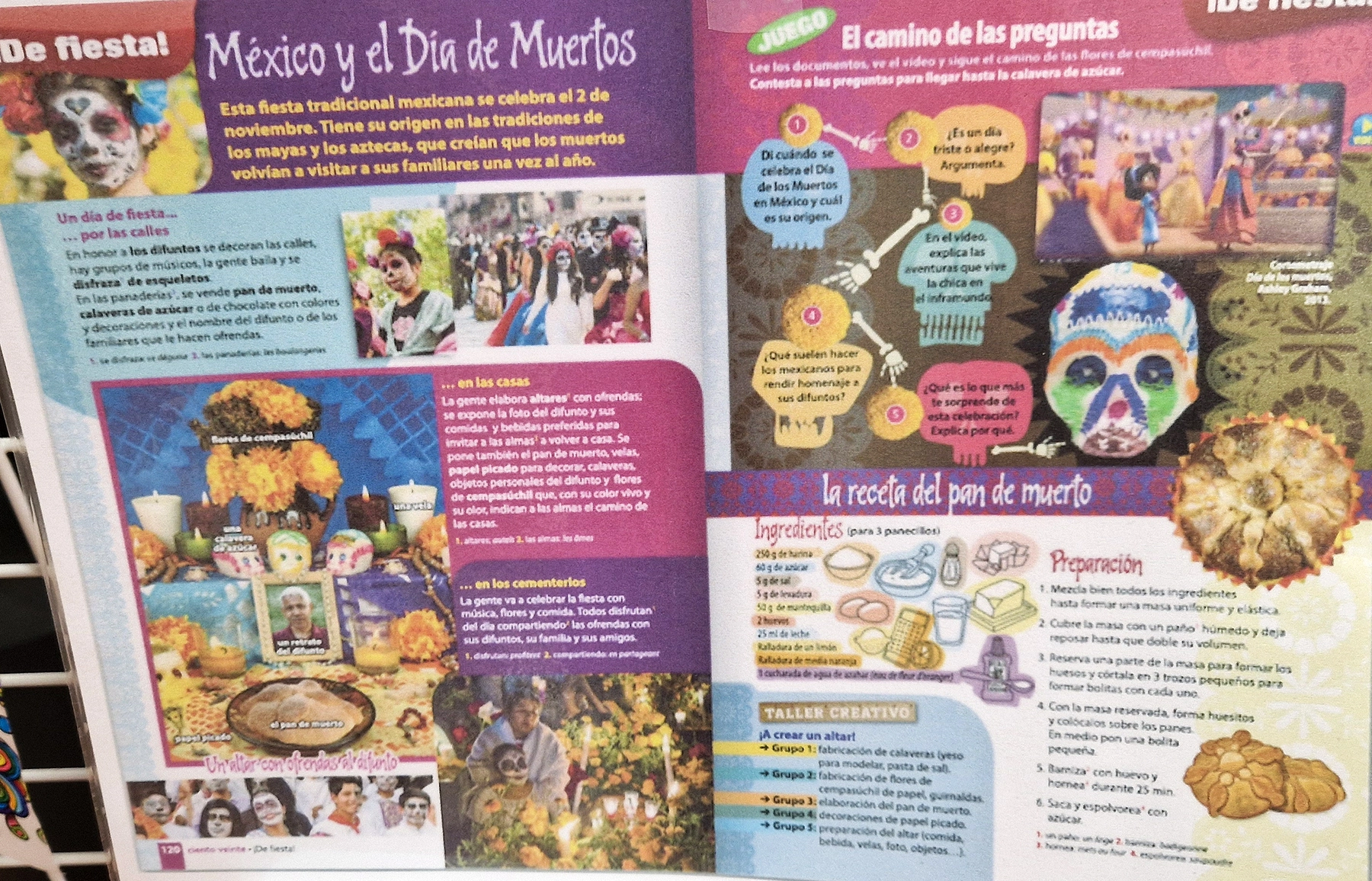 Traditions : Les familles construisent des autels (ofrendas) décorés de fleurs de cempasúchil (œillets d’Inde), de bougies, de photos et d’offrandes (nourriture, objets aimés par le défunt).