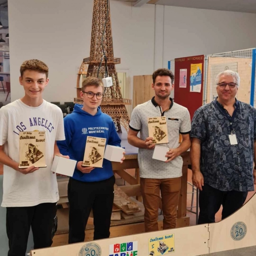 Un groupe de 9 élèves de troisième ont confectionné 2 robots qui ont gagné la première mais aussi la troisième place ! Les 2 pilotes ont fait preuve de virtuosité ;) malgrè le peu de temps pour l'entrainement, les 2 robots, très techniques étant opérationnels depuis la veille au soir !