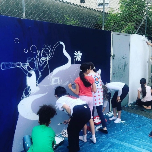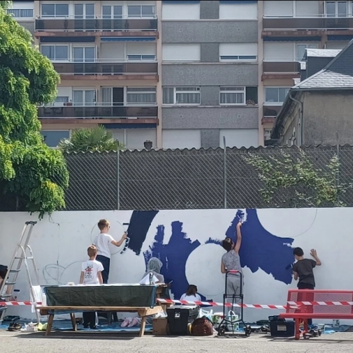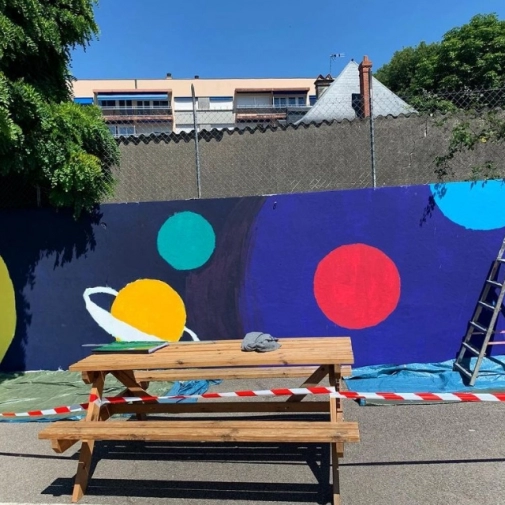 Fresque peinte par les élèves du Pradeau sur le mur de la cour.