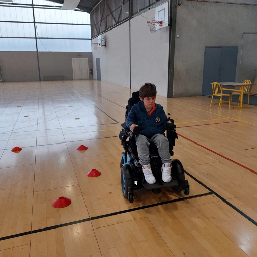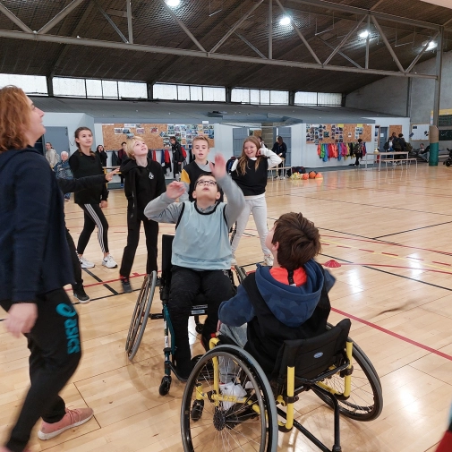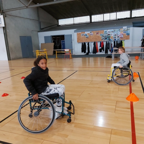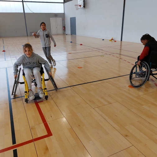 - Match de basket avec deux fauteuils et les autres élèves en simulant une amputation d’un bras