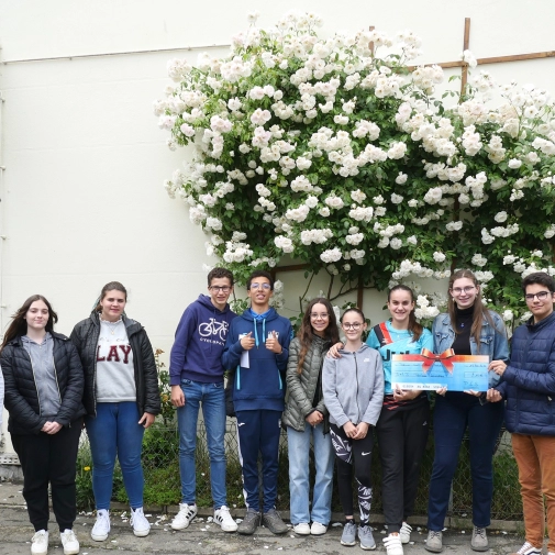 Grâce à cette action, ils ont remis un chèque de 210€ à Zoé, ancienne élève de l’établissement, et Corentin, de la team JMJ.