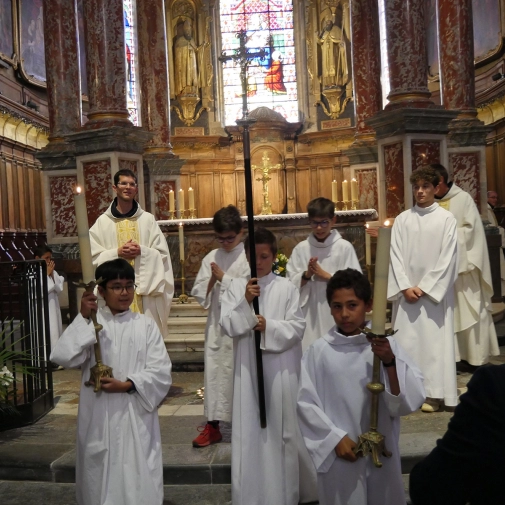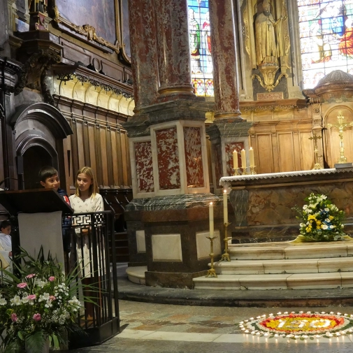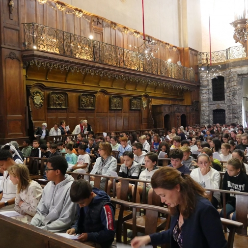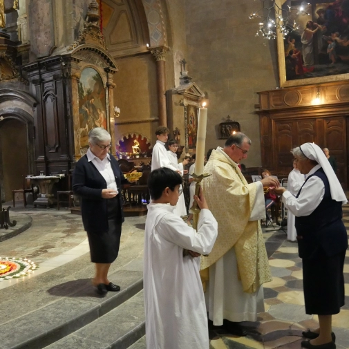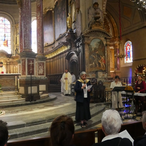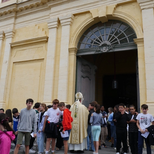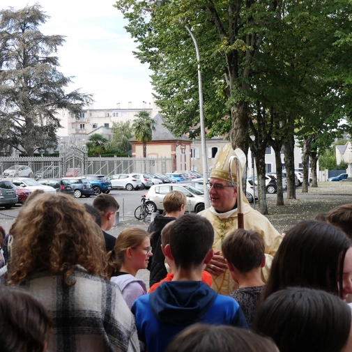 Les nombreux élèves, de tout âge, plusieurs Sœurs de saint-Joseph de Tarbes et des Filles de La Croix, les enseignants, personnels, retraités, ainsi que les familles ont entendu l’Evangile selon Saint Jean :
