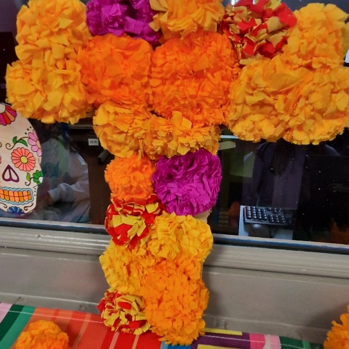 Les élèves ont crée des flores de Cempasúchil avec du papier crépon (fleur orange emblématique de cette fête ), et ont réalisé des fausses bougies avec du carton et du papier, ils ont également dessiné et colorié des calaveras (tête de mort) et des guirlandes en papel picado (papier à trous) . Les élèves ont décidé ensemble des différents éléments à ajouter sur cet altar.