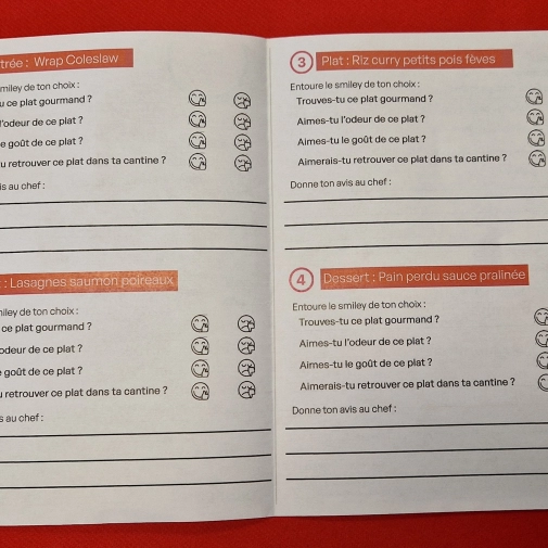 Une entrée, deux plats et deux desserts nous ont été proposés dans le but de répondre à un questionnaire sur la gourmandise, l’odeur, le goût et sur notre souhait de retrouver ce plat à la cantine.