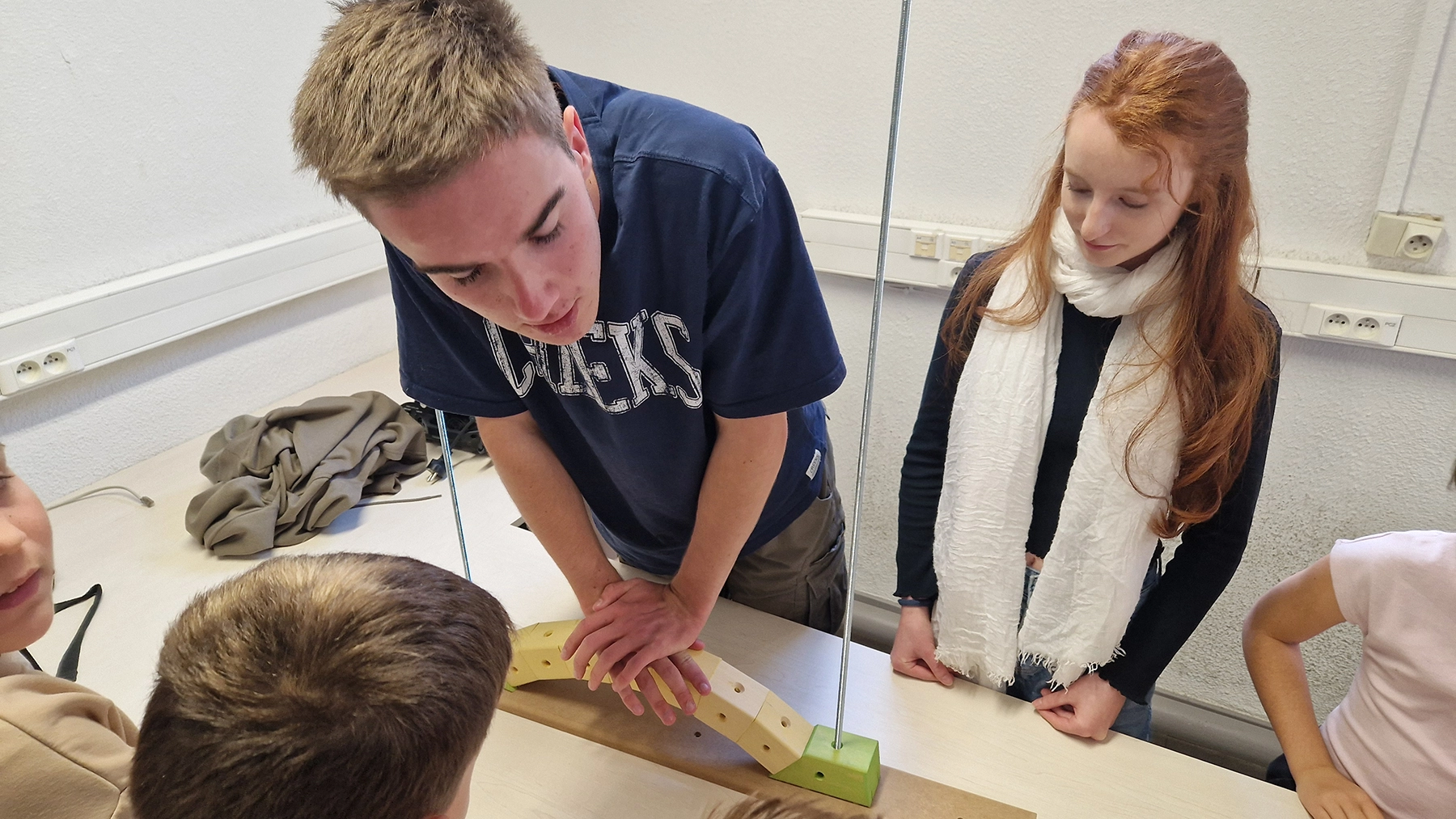 Pont en voûte et clé de voûte Les élèves ont assemblé un pont en forme de voûte à partir de morceaux de bois pré-découpés. En plaçant la clé de voûte au centre, ils ont constaté que l’ensemble pouvait supporter une pression importante sans s’effondrer. Une démonstration concrète de la solidité des structures architecturales utilisées depuis l’Antiquité.
