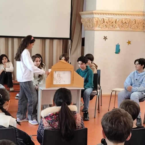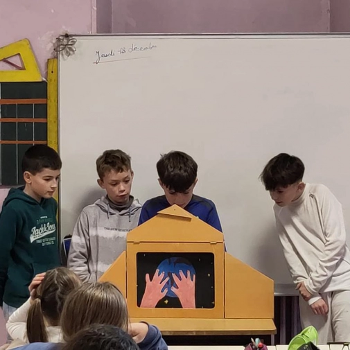Dans le cadre du travail mené en cours de français sur les récits de création, les élèves de 6ème A, D et E ont inventé leur propre histoire, ils l’ont illustrée et l’ont présentée sous forme de kamishibaï (théâtre japonais).