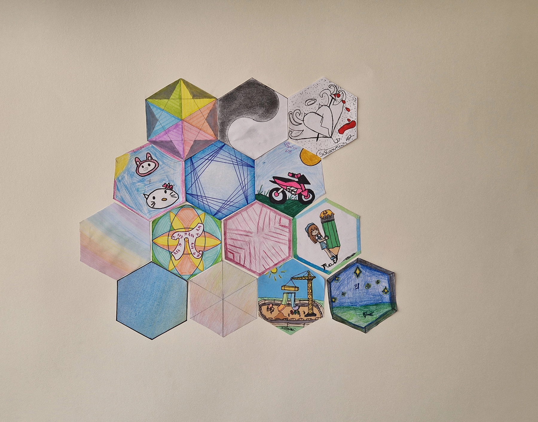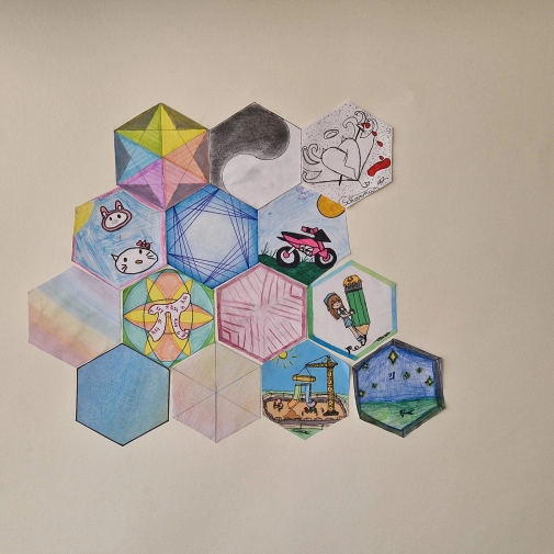 🎨 Un pavage collaboratif prend forme grâce à la création d’hexagones coloriés par les élèves : un bel affichage collectif en préparation.