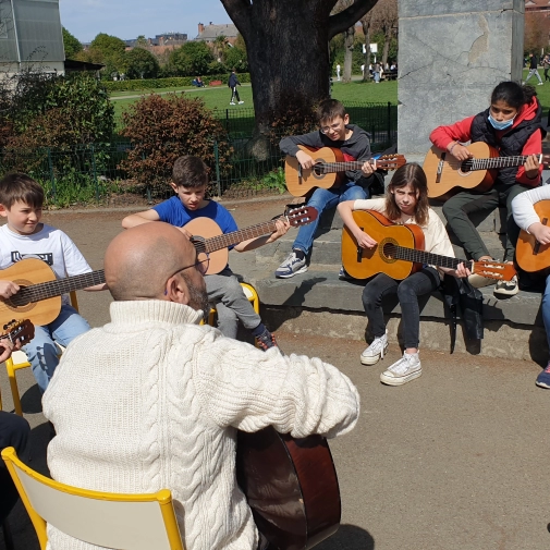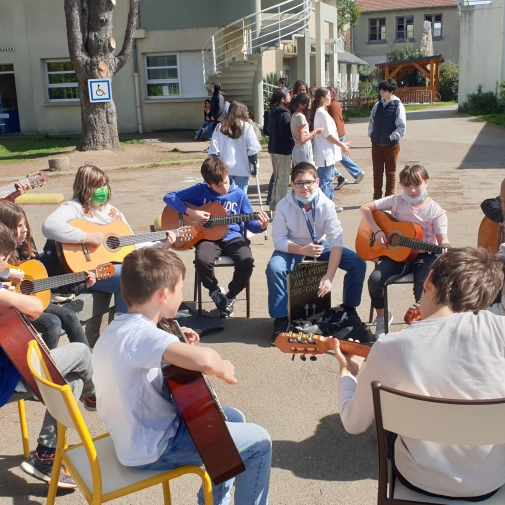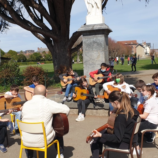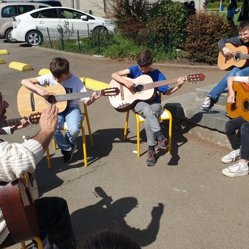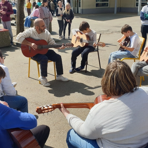 Les cours de guitare pour les 6èmes et 5èmes qui le souhaitent sont le mardi de 12h15 à 13h15 et sont assurés par Christophe Criado , musicien et chanteur !